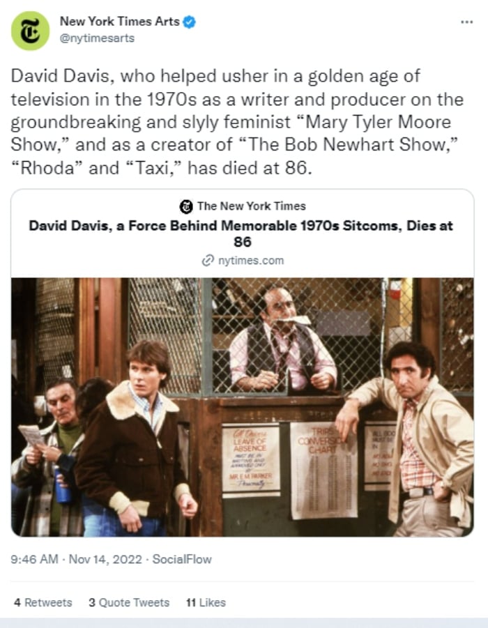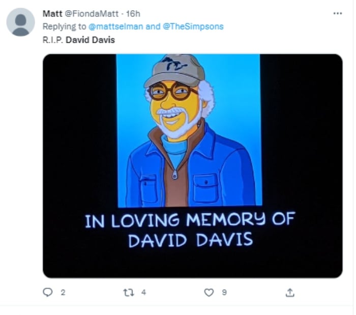 «David Davis, quien ayudó a marcar el comienzo de una era dorada de la televisión en la década de 1970 como escritor y productor en el revolucionario y astuto feminista “Mary Tyler Moore Show”, y como creador de “The Bob Newhart», dijo otro usuario. También se han estado publicando imágenes del director como caricatura de Los Simpson. Archivado como: Muere guionista David Davis